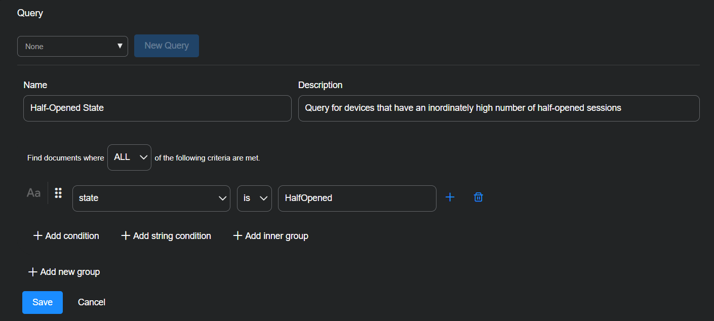Create an Automated Threat Hunting (ATH) playbook to detect devices that formed unusually high numbers of half-opened sessions in a short period of time. A surge in half-opened sessions over a limited timeframe might indicate unstable communication behavior, misconfigured services, or the early stages of malicious activity. This example shows how to query traffic records for these patterns and configure the playbook to trigger when thresholds are exceeded.