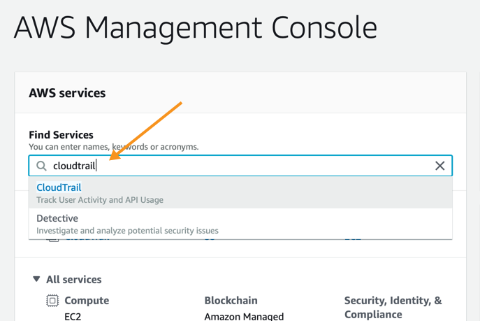 In Find Services, start entering cloudtrail. As you type, suggestions appear. Click on CloudTrail.