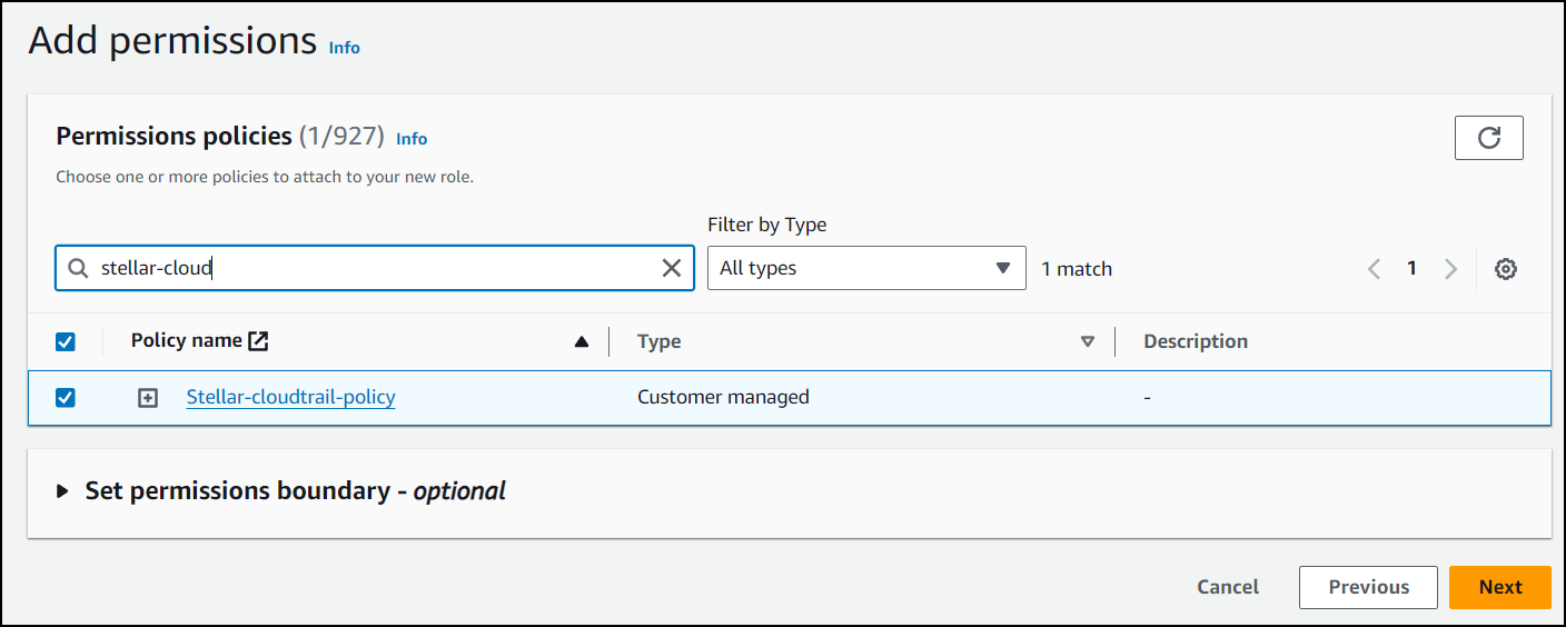 On the Set permissions page, choose Attach policies directly. Then search for the policy you created above.
