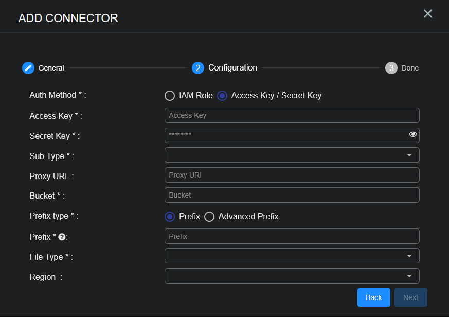 For Access Key / Secret Key Auth Method: Access Key, Secret Key, Sub Type, Bucket, plus Prefix type (Prefix or Advanced Prefix), and File Type