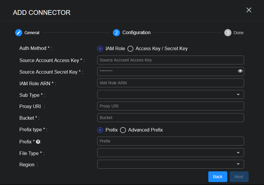 Source Account Access Key, Source Account Secret Key, IAM Role ARN, Sub Type, Bucket, plus Prefix type (Prefix or Advanced Prefix), and File Type