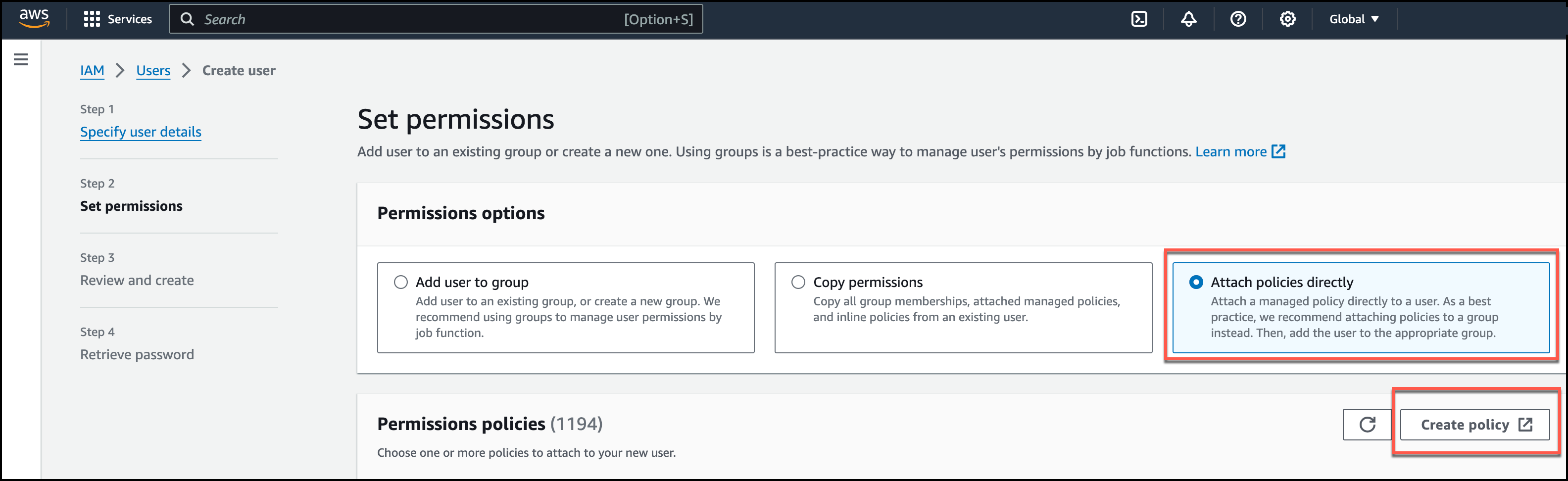 7. Choose Attach policies directly and click Create policy.