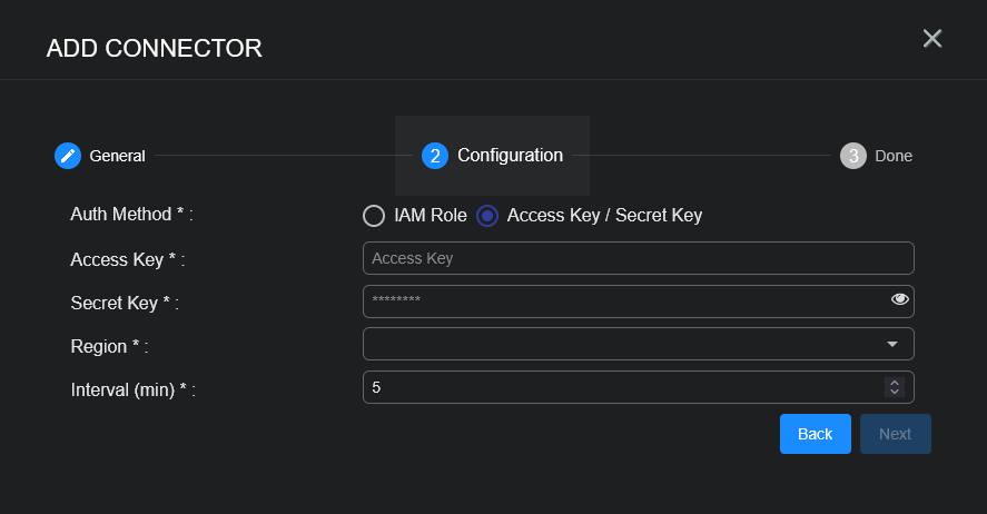 • For Access Key / Secret Key Auth Method: Access Key and Secret Key, plus Region