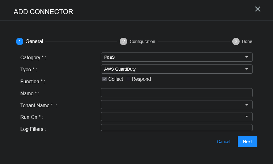 With the credential and log information available, you can now add the AWS GuardDuty connector in Stellar Cyber: