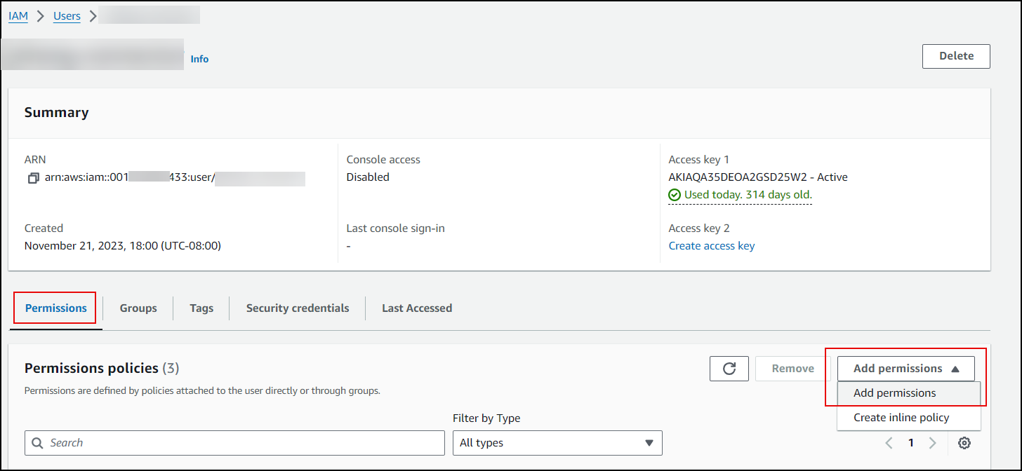 8. The Permissions policies are attached to the user.