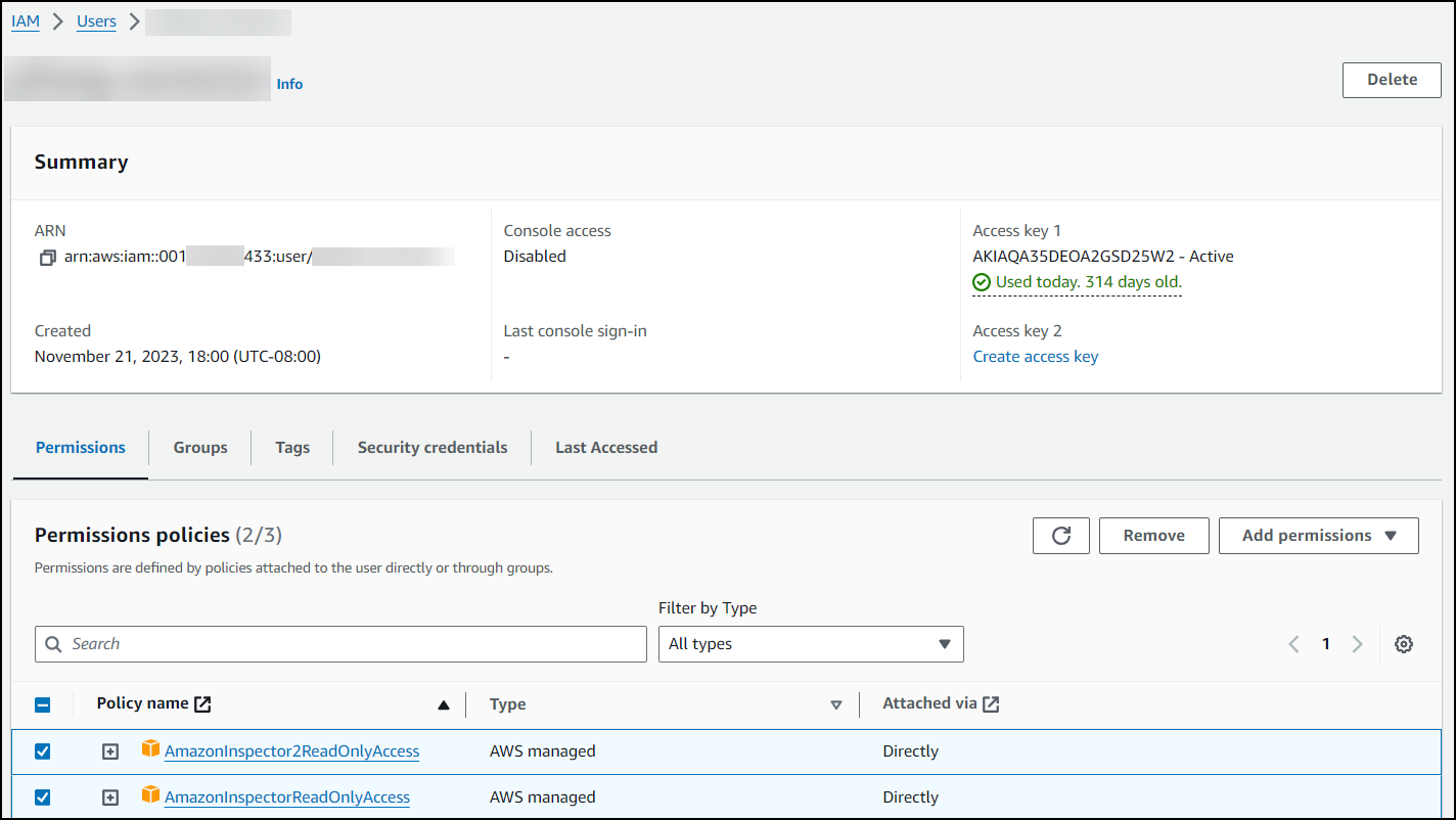 6. Select the following permissions: AmazonInspectorReadOnlyAccess and AmazonInspector2ReadOnlyAccess. (In the Search box, you can type inspector.)