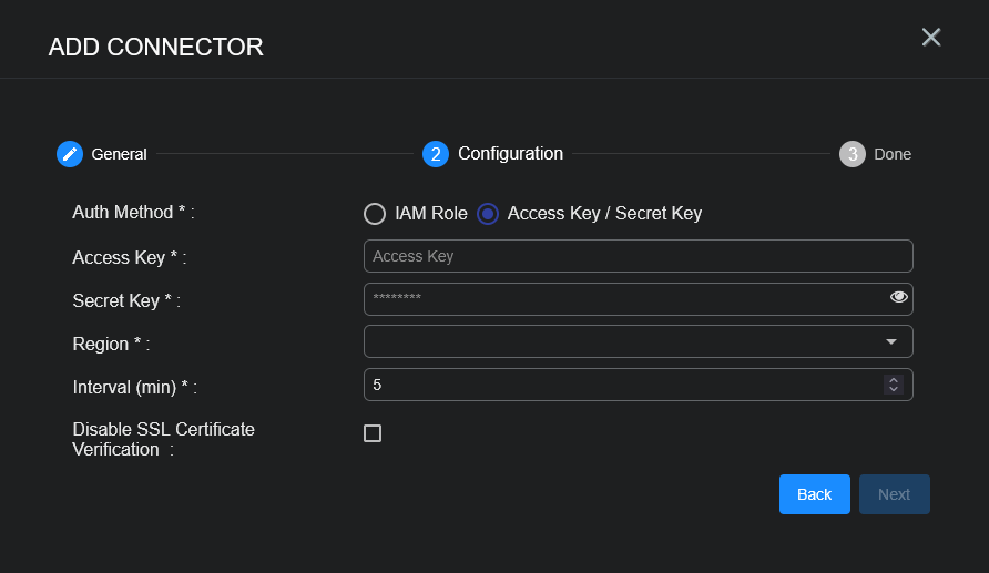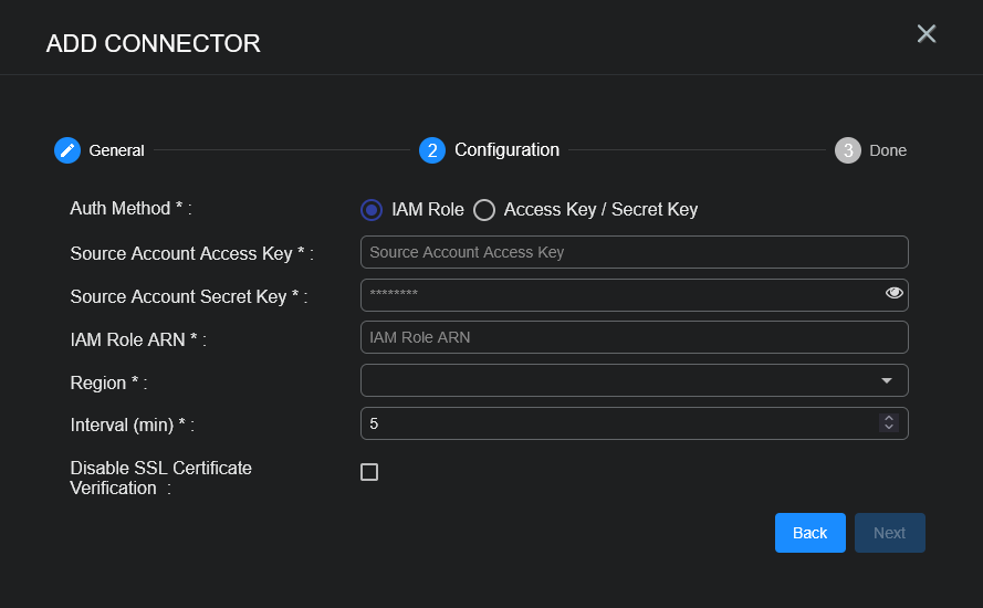 There are two authentication methods: Access Key / Secret Key or IAM Role (IAM Assume Role).