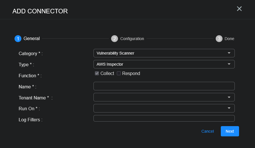 With the credential and log information available, you can now add the AWS Inspector connector in Stellar Cyber: