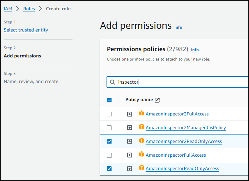 5. Select the following permissions: AmazonInspectorReadOnlyAccess and AmazonInspector2ReadOnlyAccess. (In the Search box, you can type inspector.)