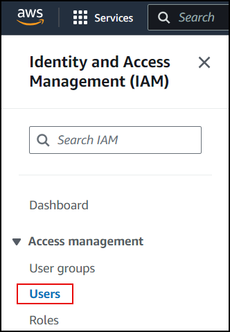 1. In the AWS Management Console, Services, navigate to Identity and Access Management (IAM) and click Users.