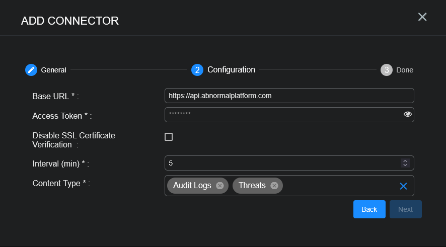 This connector ingests logs from Abnormal Security Email Security to get the raw alerts that are stored in the Syslog index. Select the Threats content type.