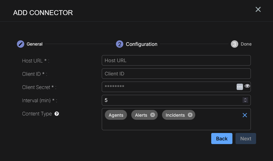 Choose the Content Type you would like to collect. The logs for Agents, Alerts, and Incidents are supported.