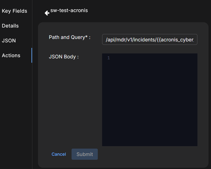 Verify the Path and Query. Enter your Acronis Cyber Protect Incident ID in the {{acronis_cyber_protect.incident_id}} parameter and your Acronis Cyber Protect Customer ID in the {{acronis_cyber_protect.customer_id}} parameter in the path, for example: /api/mdr/v1/incidents/f32a6e51-7c84-4a39-9b76-3a52b6c1942d/response_action?action=WORKLOAD_ISOLATE&customer_id=9c47a6f2-84d5-4e33-9f11-52f70a6e9b28