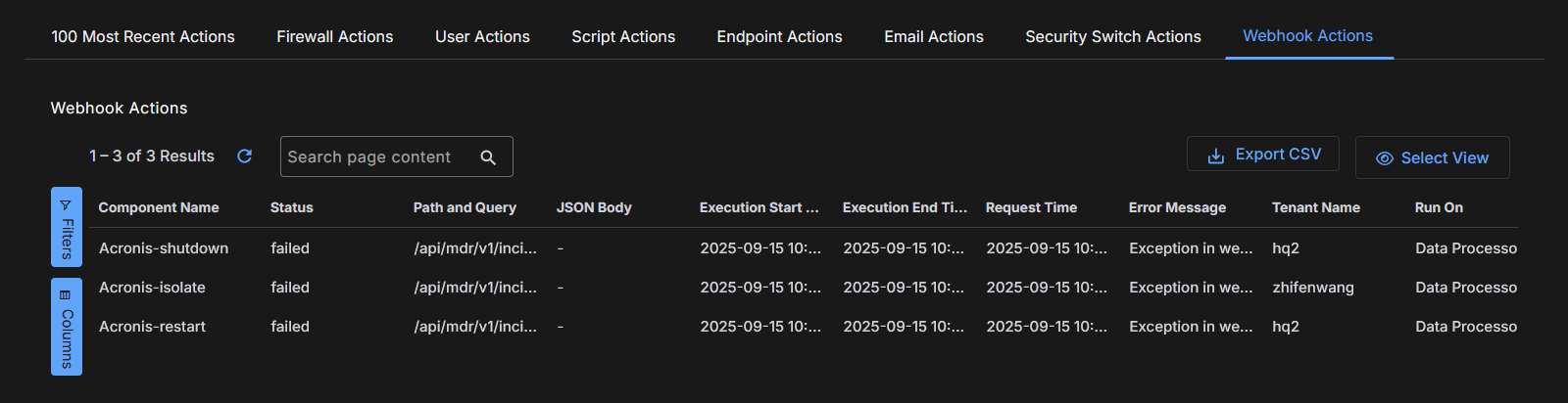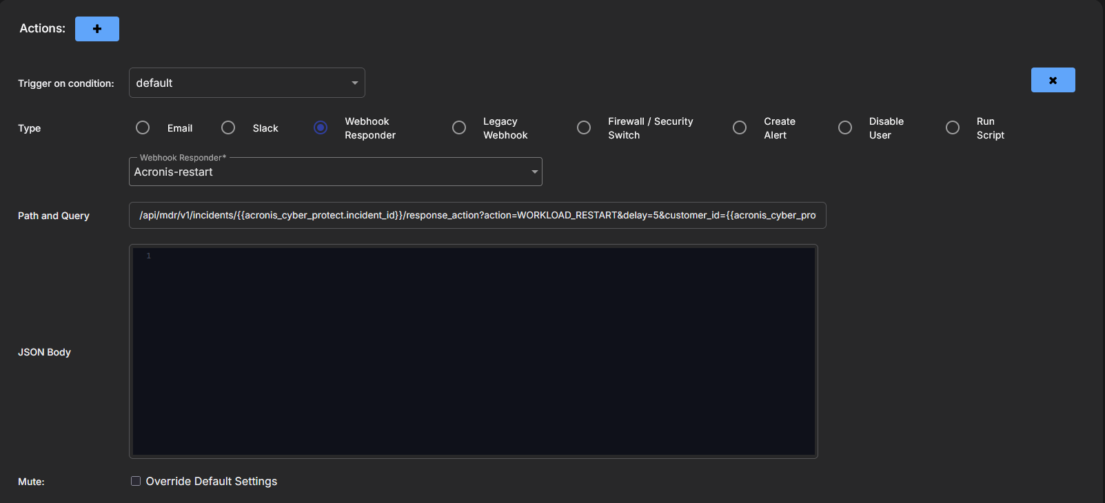 Acronis responders use Webhook templates that support actions. Each action is one responder, there are three actions, and hence there are three Acronis responders: Acronis Workload Isolate, Acronis Workload Restart, and Acronis Workload Shutdown.