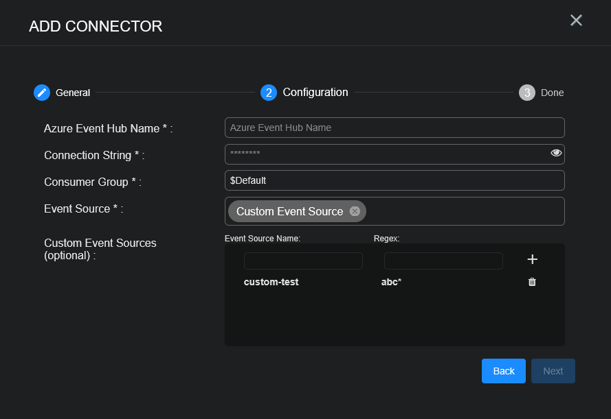 In the Custom Event Sources (optional) area, enter a name for the Event Source Name that is unique within the connector. The name will be used for setting the