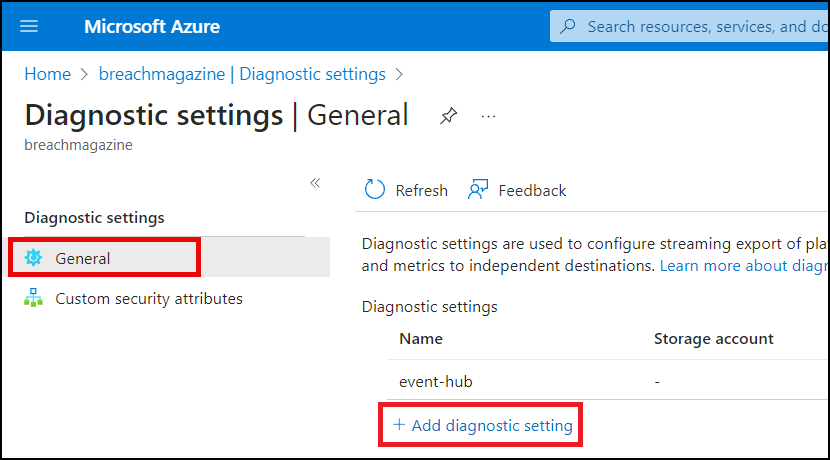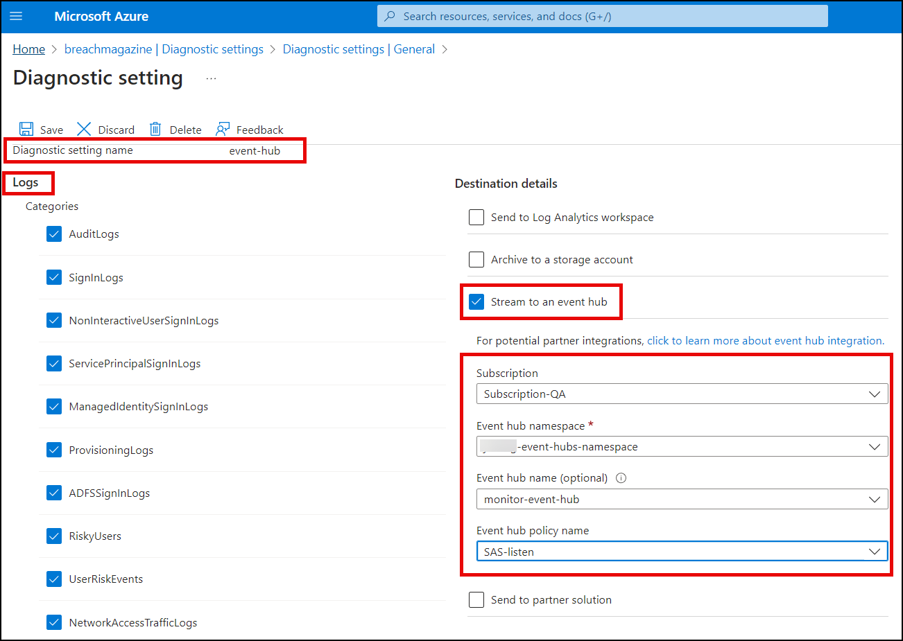 To stream logs to an Event Hub, refer to the Microsoft documentation.