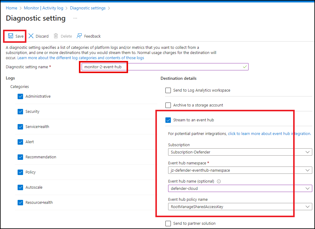 For where you want to route the logs, select the Subscription, Event hub namespace, optional Event hub name, and Event hub policy name.