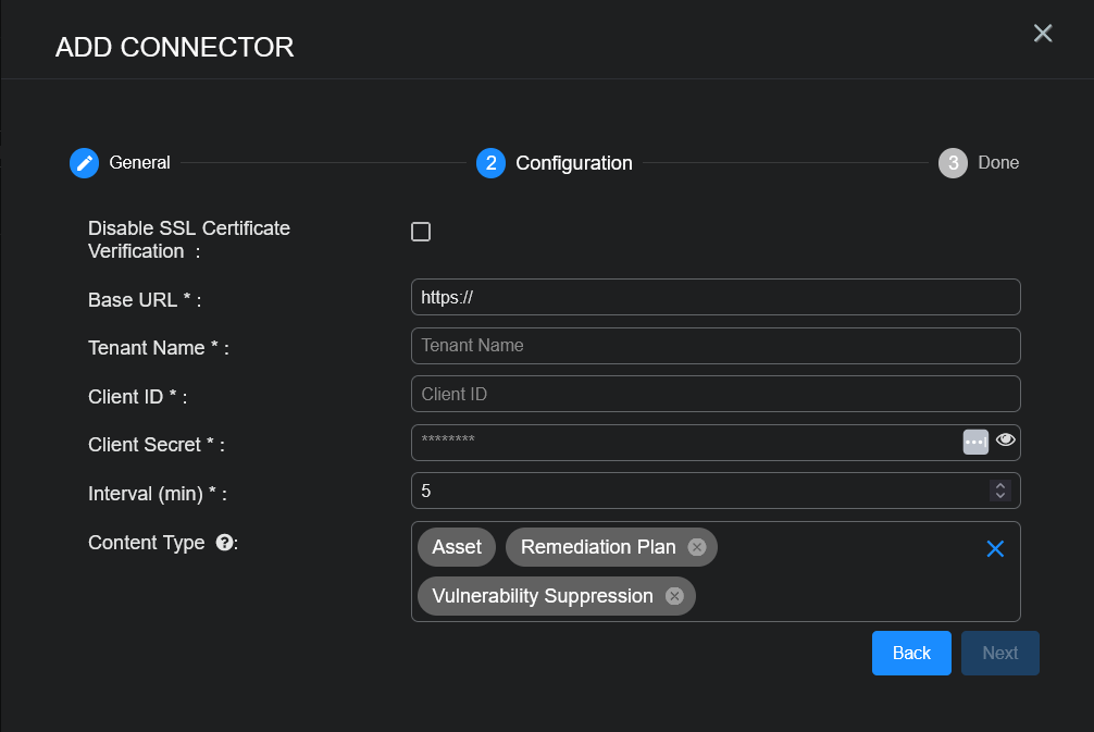 Choose the Content Type you would like to collect. The logs for Asset, Remediation Plan, and Vulnerability Suppression are supported.