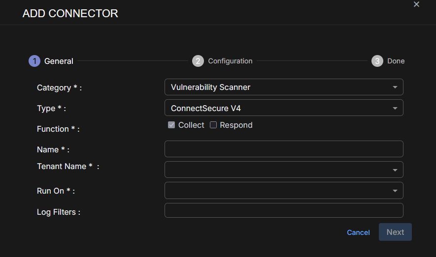To add a ConnectSecure V4 connector in Stellar Cyber: