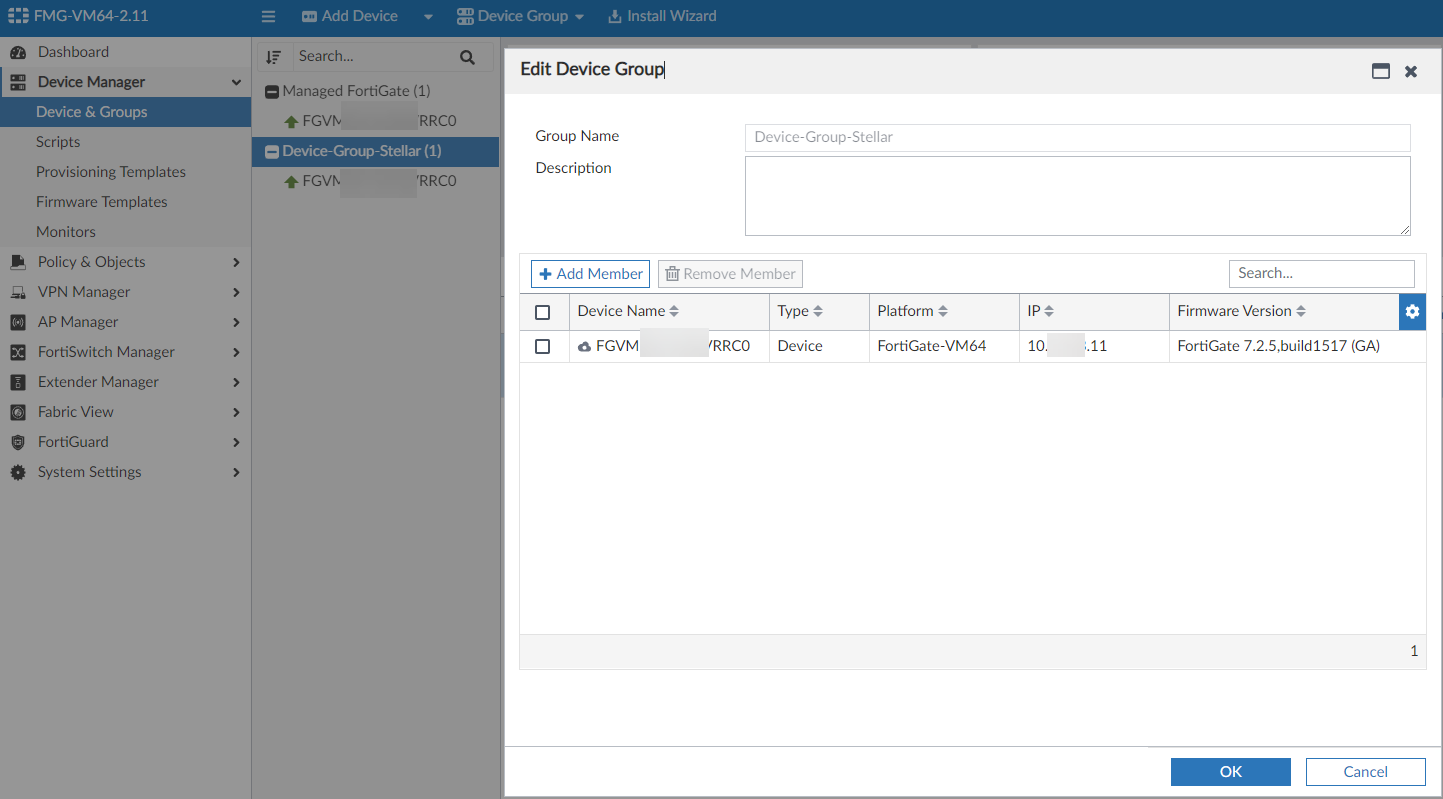 To create a device group and add the FortiGate firewalls to it, follow the guidance in the Fortinet documentation to Add device groups.