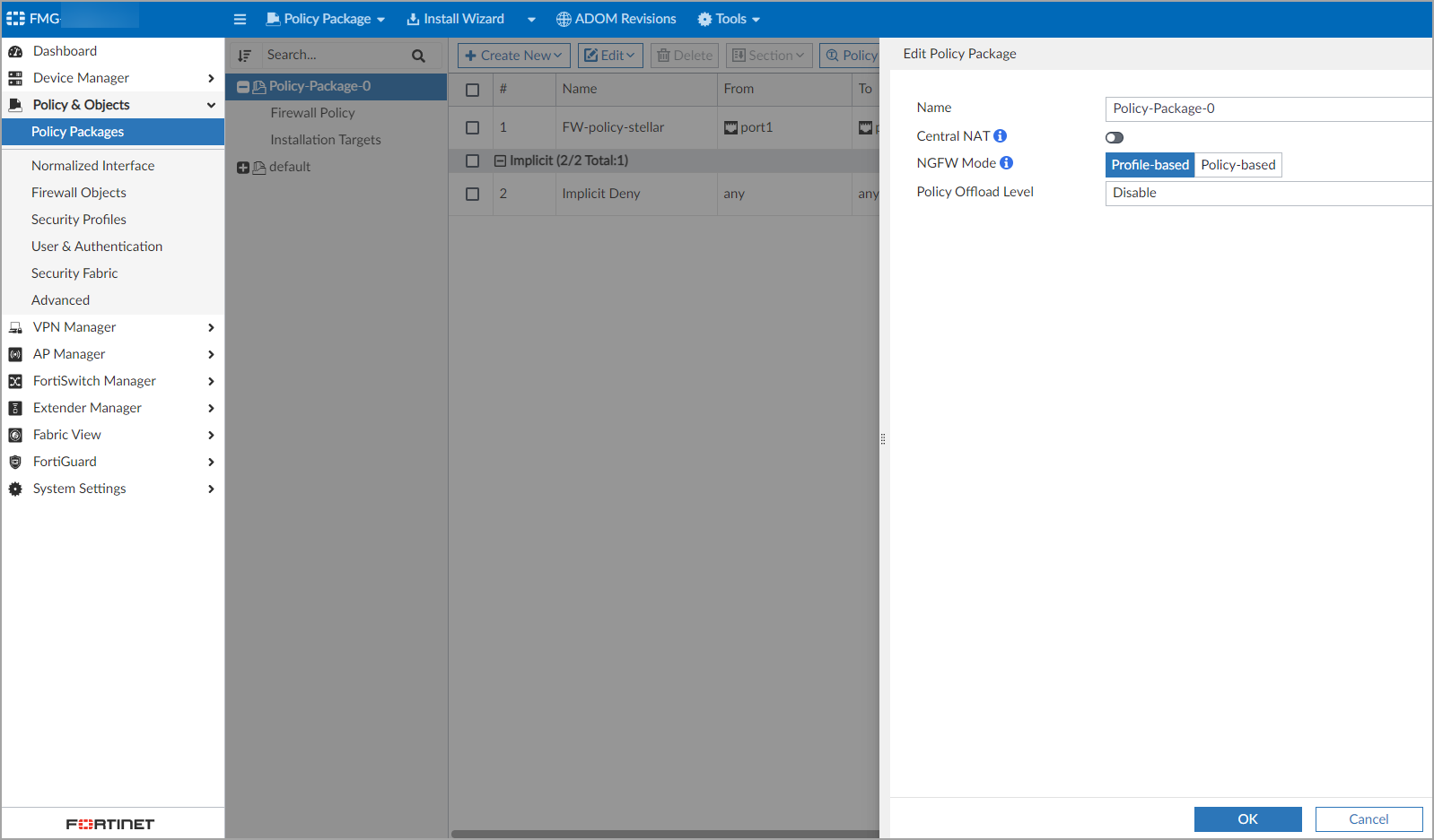To create a policy package, follow the guidance in the Fortinet documentation to Create new policy packages.