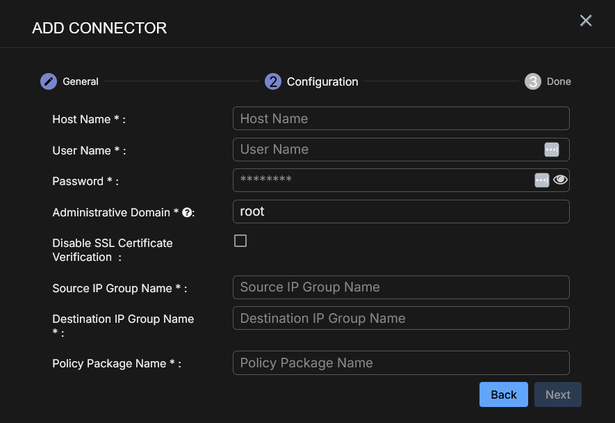 Host Name, User Name, Password, Administrative Domain, Source IP Group Name, Destination IP Group Name, and Policy Package Name