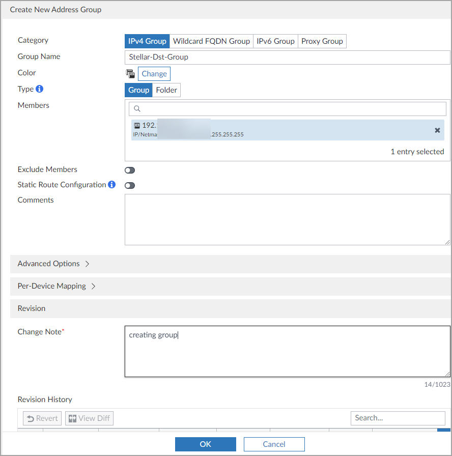 In the New Address Group window, enter a group name. In this example, it is Stellar_Dst_Group.
