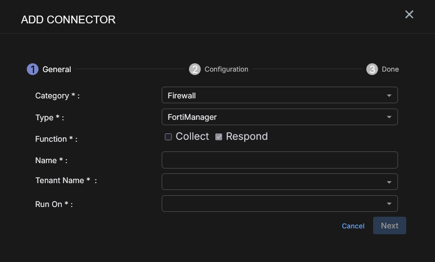To add a new FortiManager connector in Stellar Cyber: