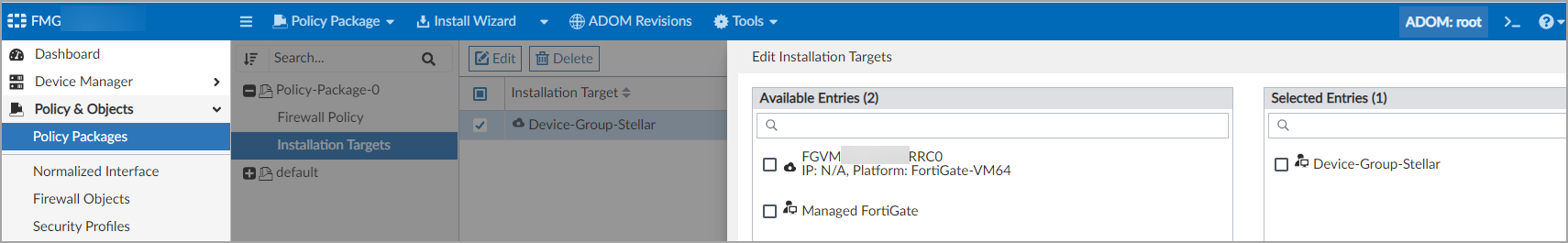 To create an installation target, follow the guidance in the Fortinet documentation for Policy package installation targets.