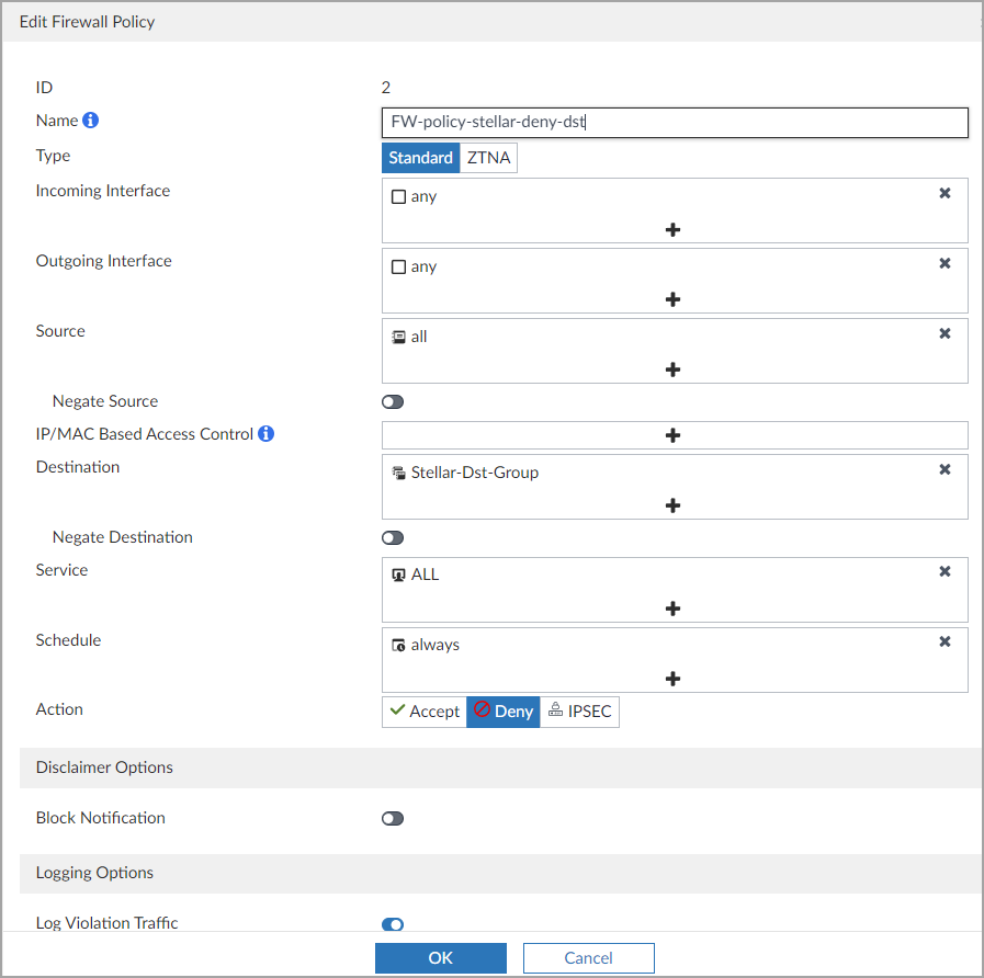 To create a deny firewall policy for destination, follow the guidance in the Fortinet documentation to Create New Firewall Policy.