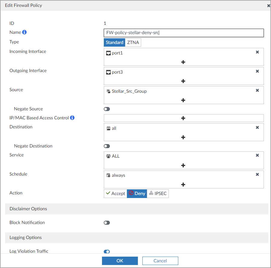 Enter a firewall policy Name. In this example, it is FW-policy-stellar-deny-src.