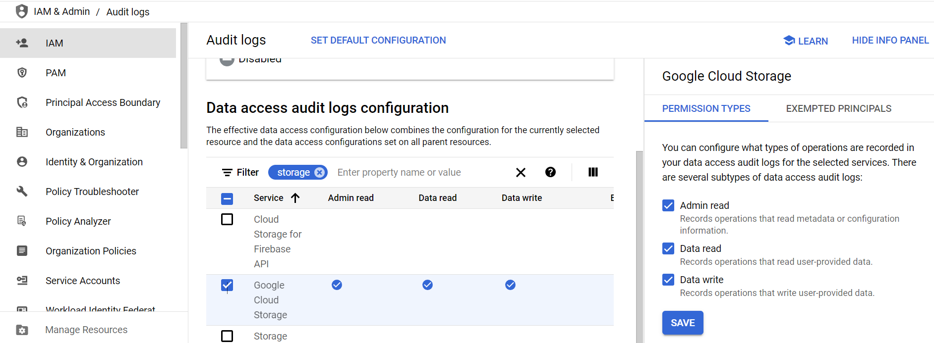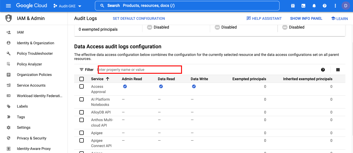 In the page that displays, locate the Filter field (Enter property name or value) for Data Access audit logs configuration.