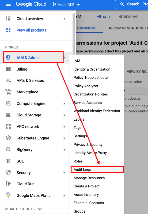 Audit Logs for the service account must have Admin Read, Data Read, and Data Write enabled for the Kubernetes Engine API or for Google Cloud Storage.