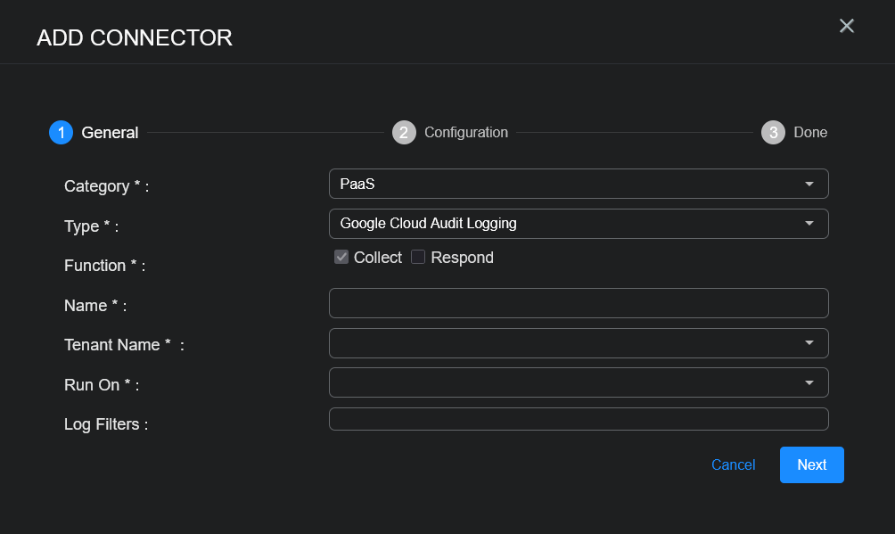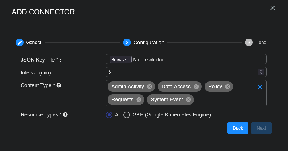 With the Google service account set up and the API key ready, you can add the Google Cloud Audit Log connector in Stellar Cyber: