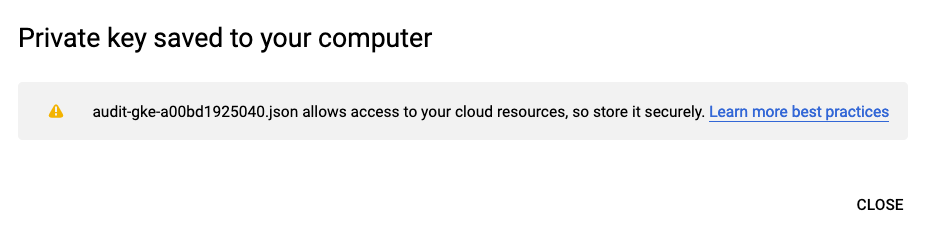 Click Create. The JSON file is downloaded. Keep this file safe, as you cannot recover the key if this file is lost. You will upload this file to Stellar Cyber when configuring the connector.