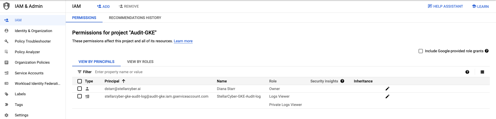 The permissions page now displays the service account with the needed permissions to collect logs.