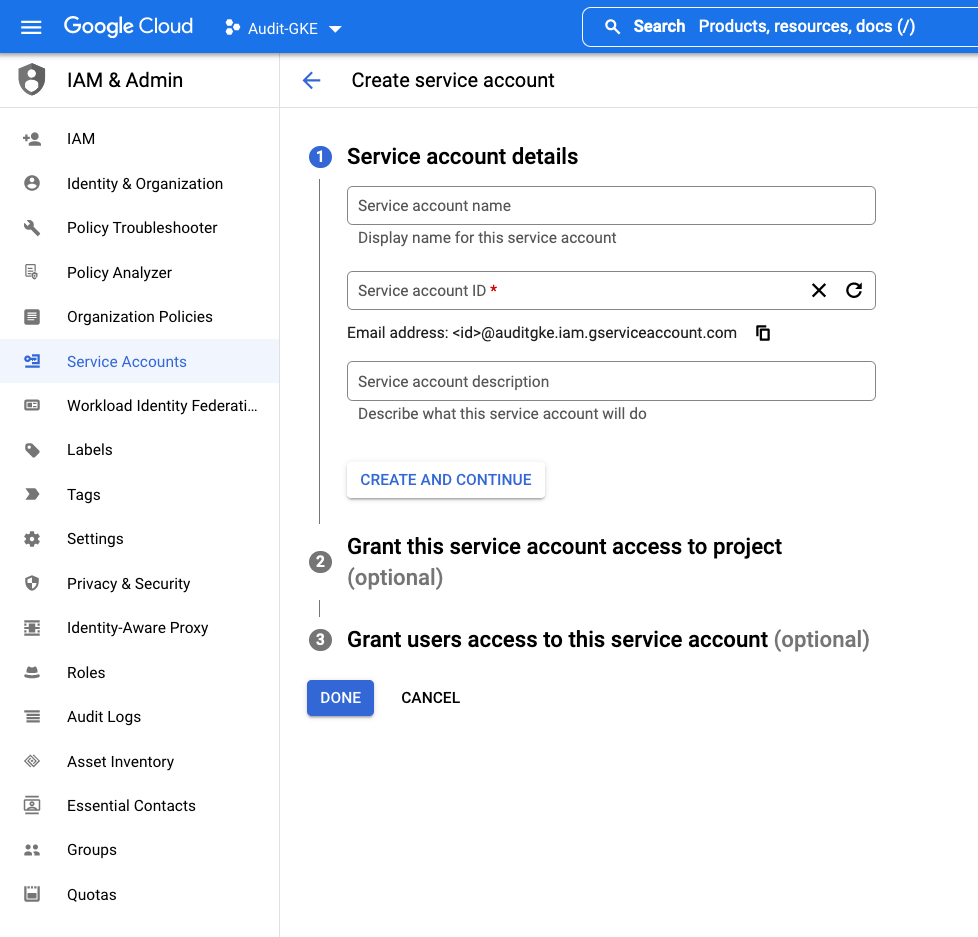 To create a service account, follow the guidance in the Google Cloud documentation to Create a service account. For more information on roles, see the Google Cloud documentation for Access control with IAM.