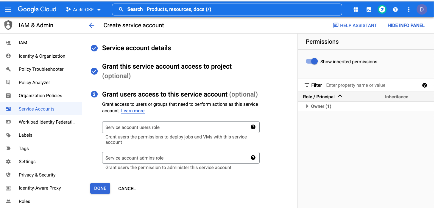 In the section for granting users access to the service account, do not specify any users. Click Done.