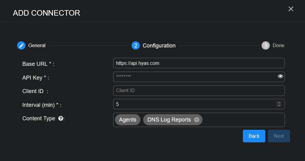 This connector ingests logs from HYAS Protect to get the raw alerts that are stored in the Syslog index. Select the DNS Log Reports content type.