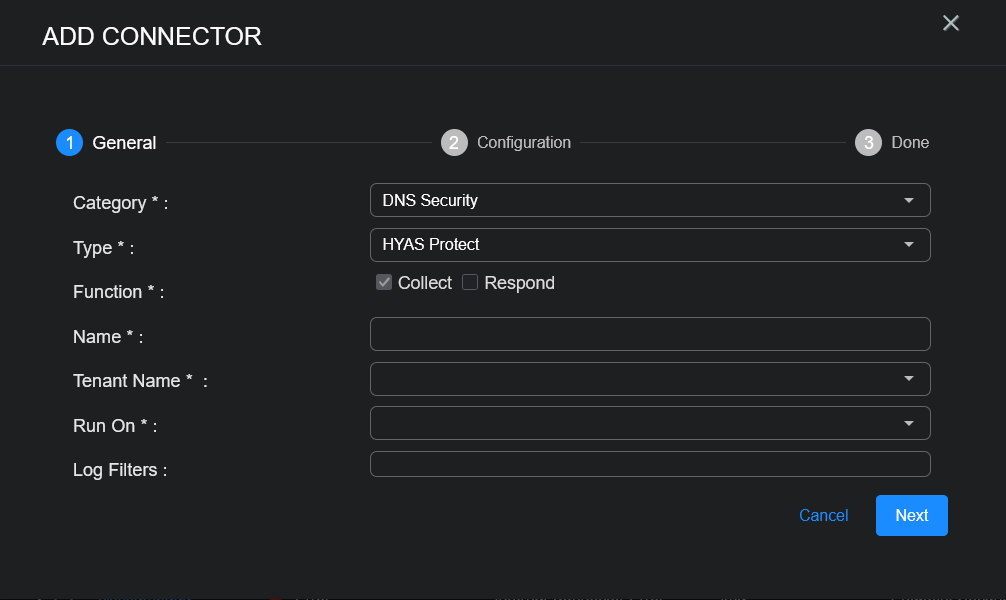 This connector allows Stellar Cyber to ingest logs from HYAS Protect and add the records to the data lake. This connector integrates with the HYAS Protect API to query for DNS log reports. It supports ingesting records, generating assets, and alerting on data from HYAS Protect to monitor DNS logs using the Stellar Cyber platform.