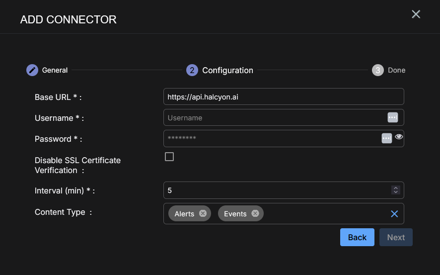 Username and Password—The authentication credentials. You must have an existing user account on the Halcyon platform with the required API permissions. Follow the guidance in the Halcyon documentation.