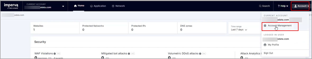 In the Cloud Security Console, click Account at the top right of the page and select Account Management.