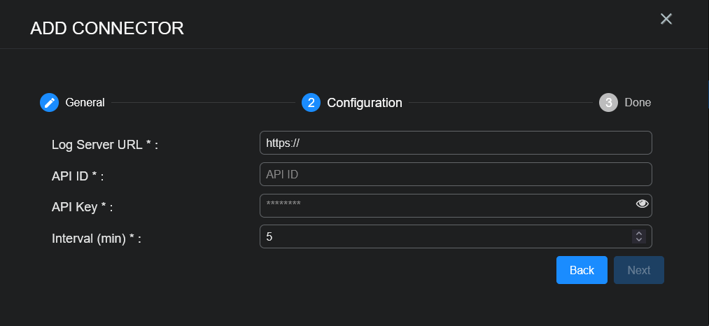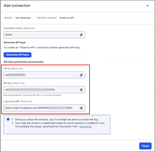 Copy the generated API ID, API key, and Log server URL, which will be used to add the connector in Stellar Cyber.