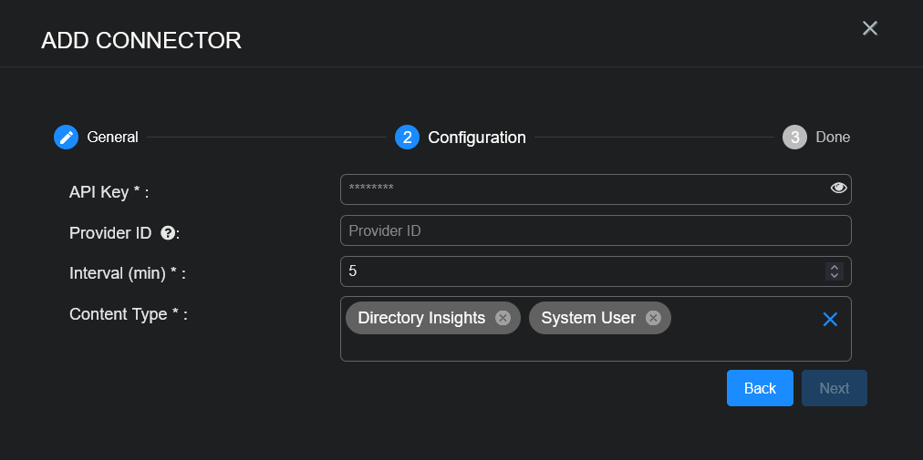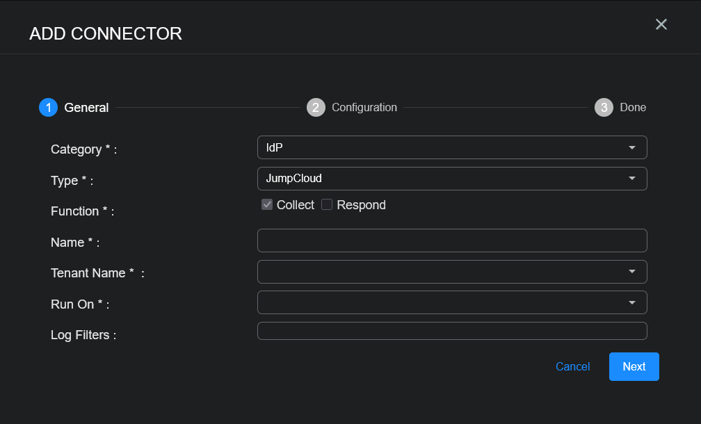 With the configuration information handy, you can add the JumpCloud connector in Stellar Cyber: