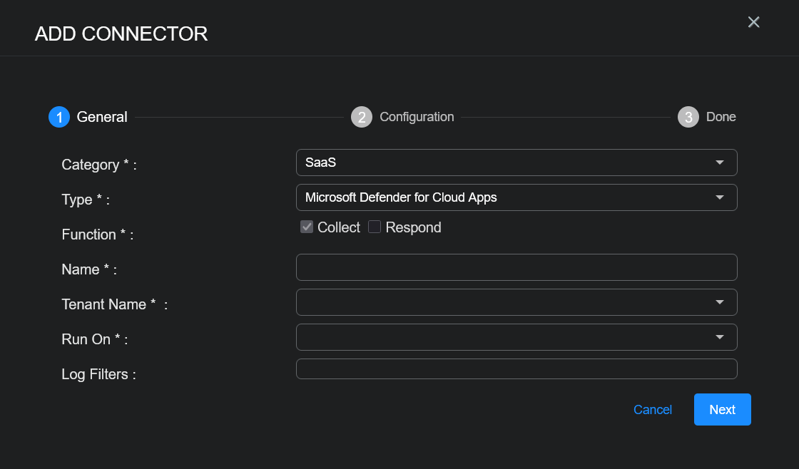 To add a Microsoft Defender for Cloud Apps connector in Stellar Cyber: