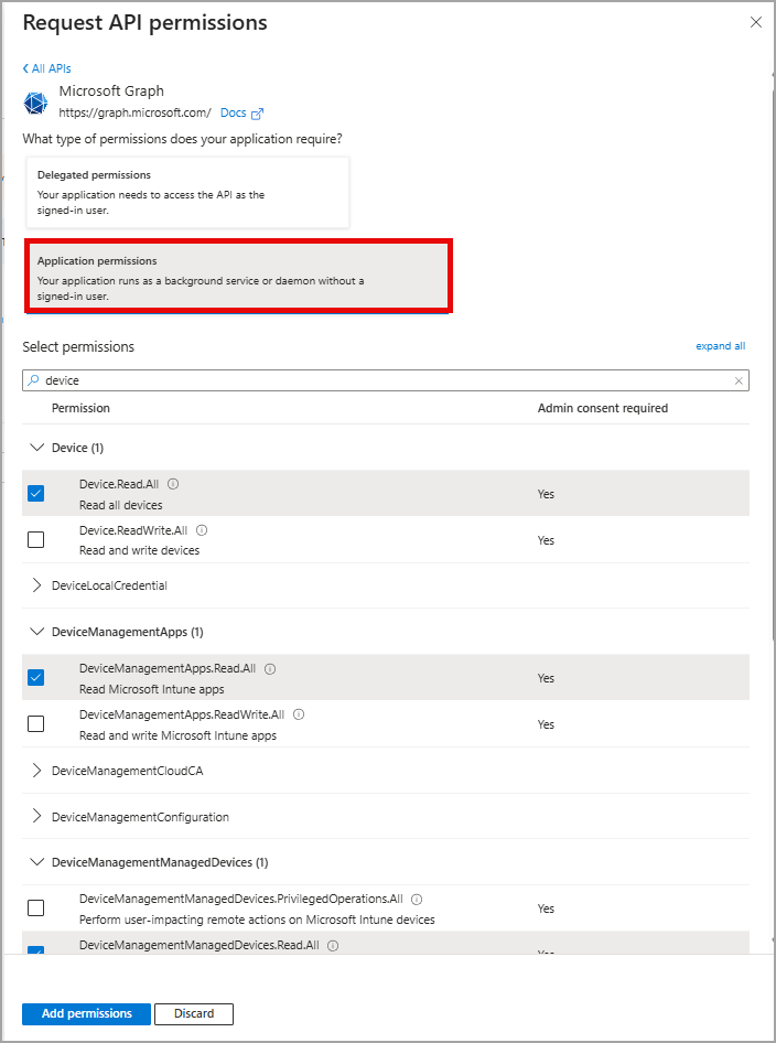 At the top, click Application permissions.