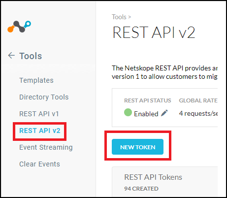 Use Netskope’s RESTful API token generation workflow under the Role-Based Access Control (RBACv3) framework to create API tokens.
