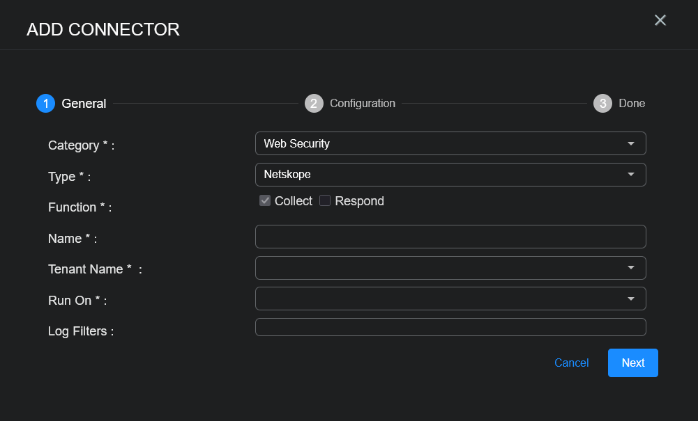 With the configuration information handy, you can add the Netskope connector in Stellar Cyber: