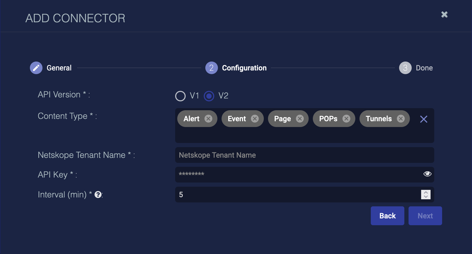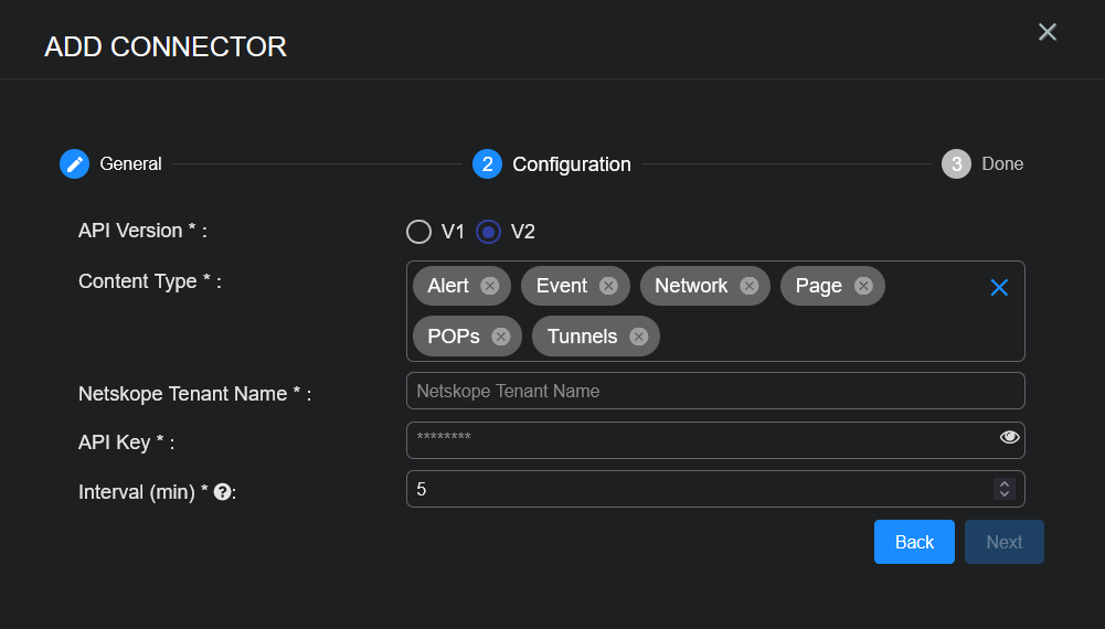 Choose the Content Type you would like to collect. For V1, the logs for Alert and Event are supported. For V2, the logs for Alert, Event, Network, Page, Pops, and Tunnels are supported.