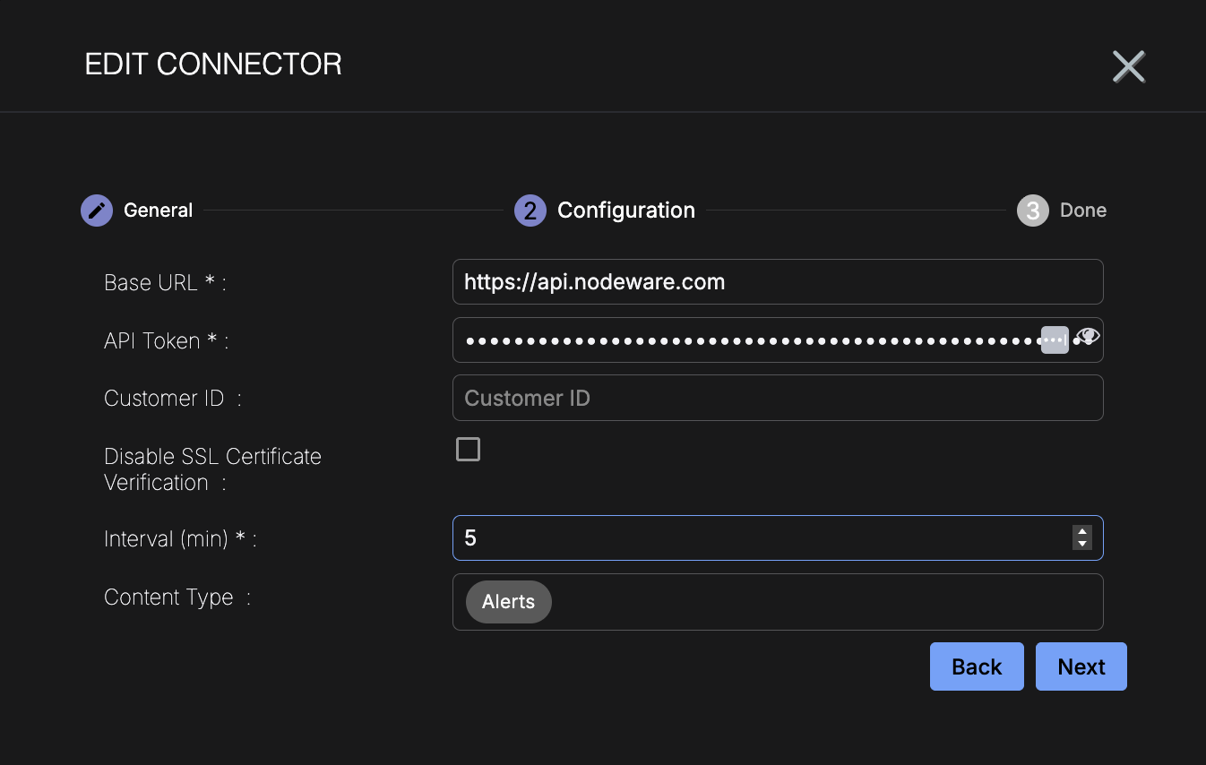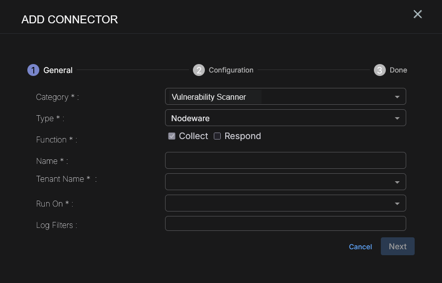 To add a Nodeware connector in Stellar Cyber: